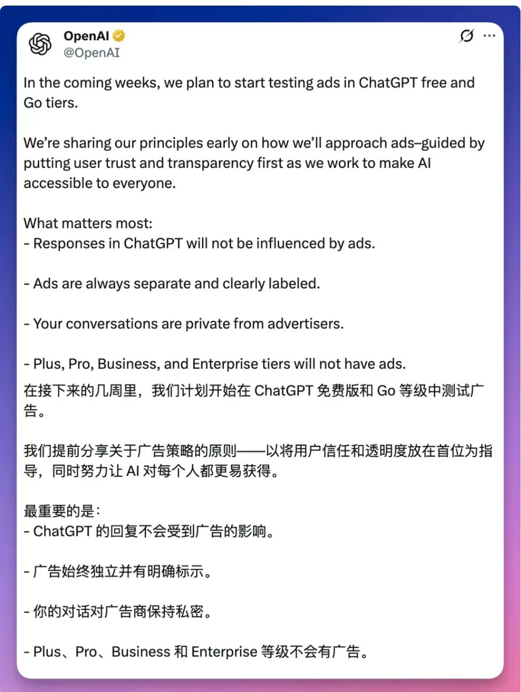 OpenAI 发布公告,将在未来几周内开始在 ChatGPT 里测试广告。
