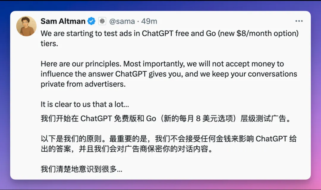 ChatGPT 终于不再遮掩。OpenAI 昨夜官宣上线广告测试,Sam Altman 随即发文补刀:「很多人想用 AI 但不想付费,我们希望这种商业模式能行得通。」