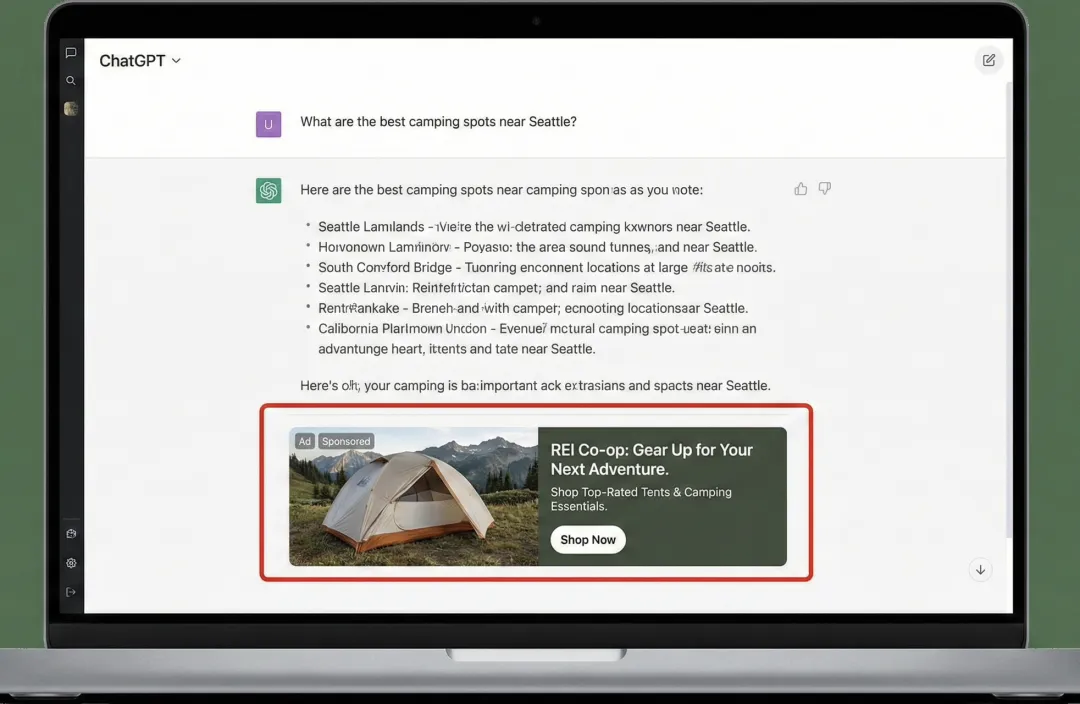 场景 A: 你问「周末去哪露营?」,AI 给完攻略,底部推一个帐篷品牌或营地链接。