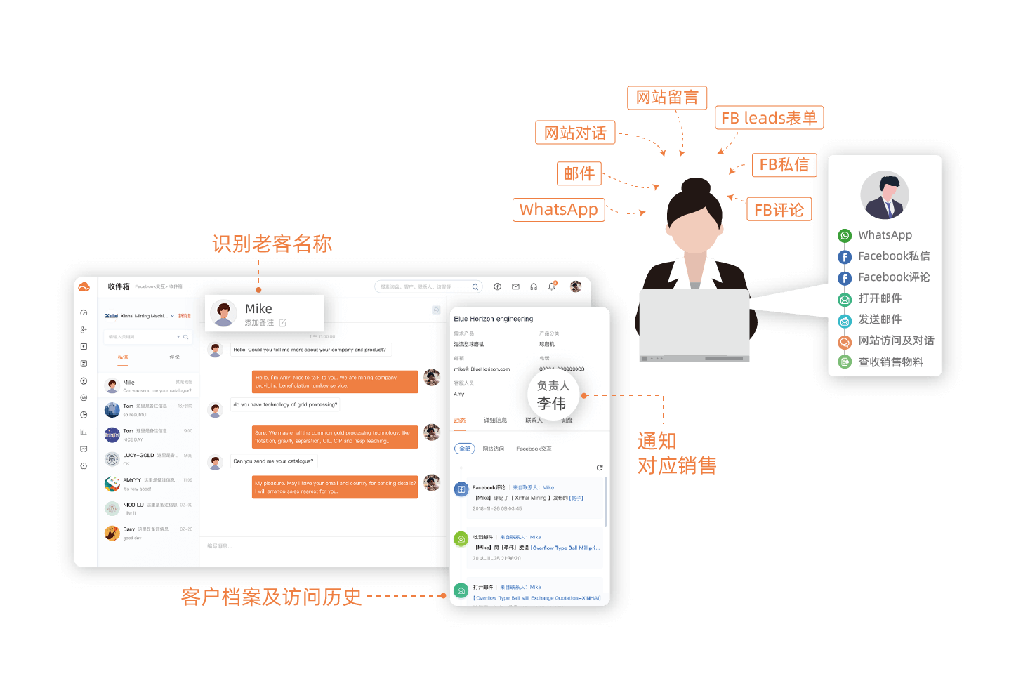 邮件收发过程中,可以一键调取客户档案,看到客户在网站、WhatsApp等其他各触点的轨迹和交互,让邮件内容更加有的放矢。