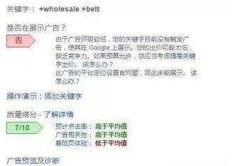 不难看出,上面的图中,预计点击率和广告相关性都高于了平均值,唯独着陆页体验低于平均值。这说明,在Google看来网站着落页的体验非常差,而这就是直接导致广告效果不理想的重要因素之一,也是很多SEMer容易忽略的地方。