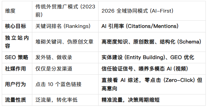 以下是外贸企业在 2026 年必须掌握的“独立站+SEO+GEO+社媒”协同作战蓝图。